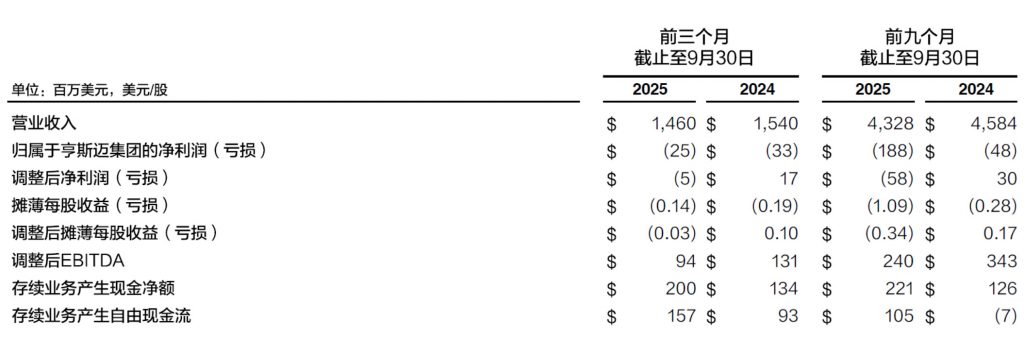 伍德兰兹,德克萨斯州—亨斯迈集团(纽交所代码:HUN)公布2025年第三季度财务业绩。该季度集团实现营业收入14.60亿美元,净亏损2,500万美元,调整后净亏损500万美元,调整后EBITDA(息税折旧摊销前利润)为9,400万美元。